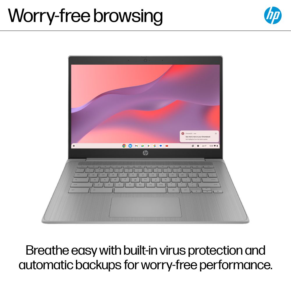The HP Chromebook 14a-ne1000na delivers responsive performance and all the Google features you love. Powered by an IntelĀ® CeleronĀ® N4500 processor and ample storage, it’s perfect for work and fun, with built-in Google apps and other popular apps. Enjoy HD video calls, streaming, and gaming on the micro-edge display, plus worry-free performance with automatic updates and built-in security.
