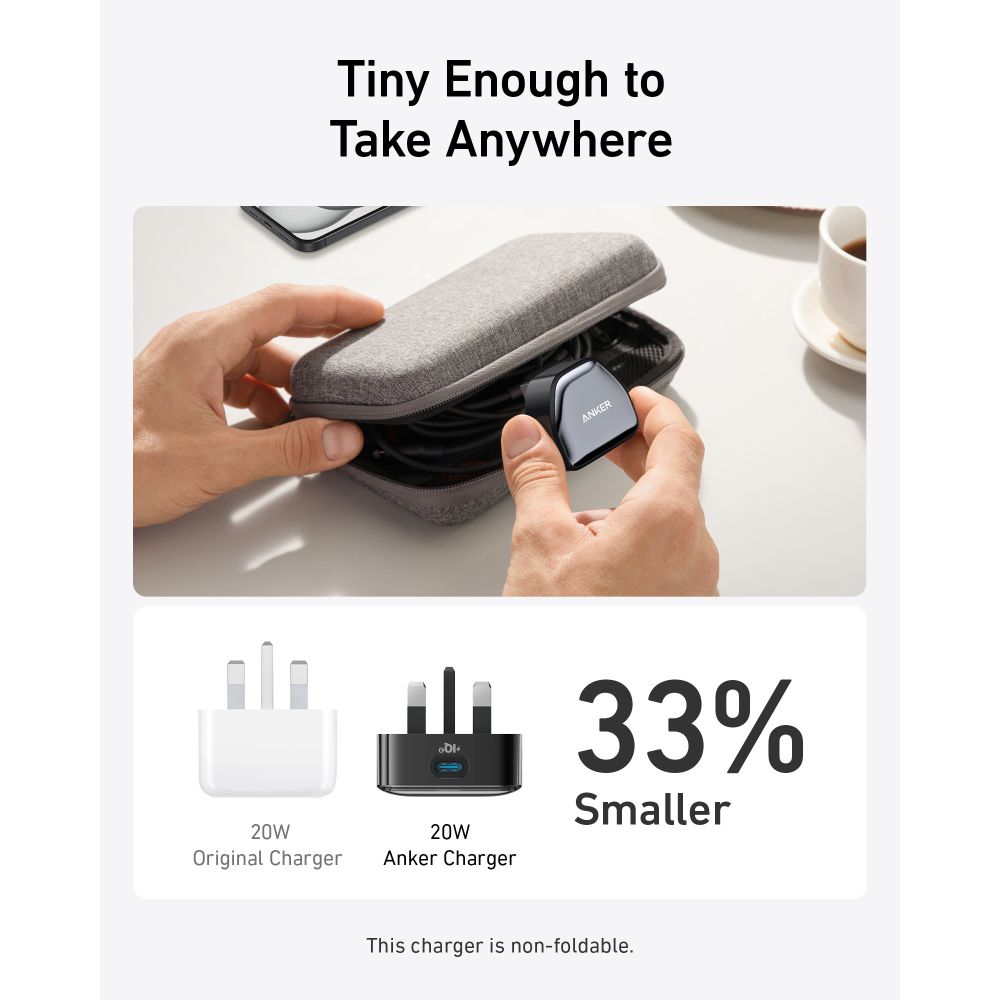 The adapter is 45% smaller than original 20W chargers. Its dimensions are 43.4 mm wide, 49.6 mm deep, and 21.5 mm high. The weight is only 49.8 g. This makes it easy to carry in a pocket or bag.