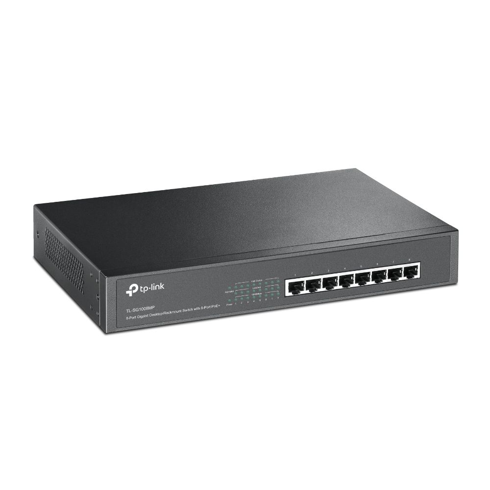 The TP-Link TL-SG1008MP network switch is an 8-port unmanaged Gigabit Ethernet switch with built-in Power over Ethernet (PoE) capability, designed to simplify network expansion by delivering both power and data through a single cable. This makes it ideal for powering devices like wireless access points, IP cameras, and VoIP phones in locations without nearby electrical outlets.