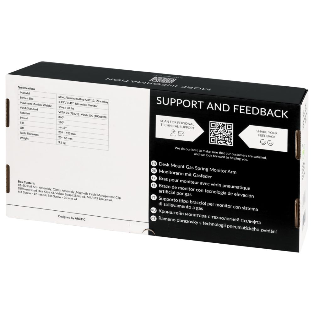 The ARCTIC X1-3D is designed for straightforward DIY installation. The clamp mechanism requires no drilling, and all necessary hardware is included. The arm arrives in a compact 228 x 445 x 124 mm box weighing 3.92 kg, making it easy to transport and store before setup.