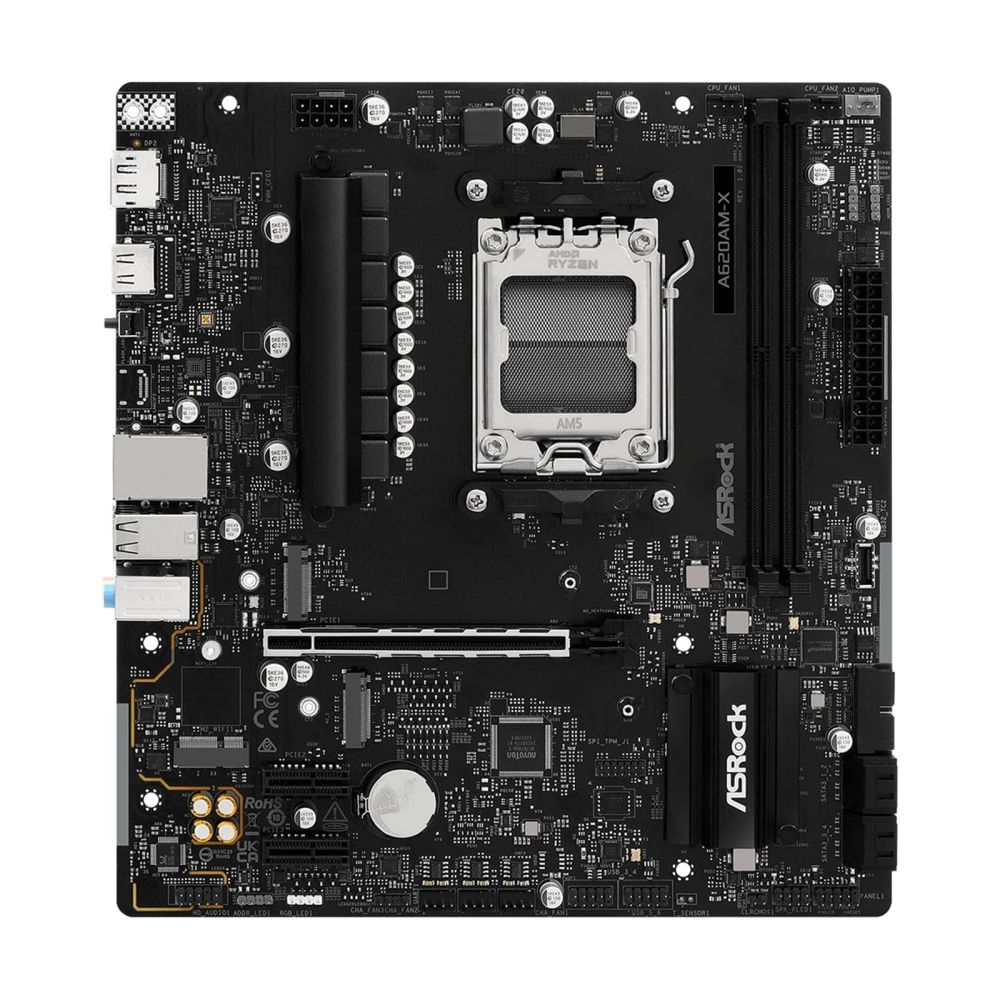 The ASRock A620AM-X AMD Socket AM5 Motherboard, 2x DDR5 Slots, 2x M.2 Socket, 2.5GbE LAN, 1x HDMI Port / 1x Display Port delivers a compact, high-value solution for Ryzen 5000/7000/9000 CPUs, combining DDR5 memory support, dual M.2 NVMe storage, and robust 2.5GbE networking in a micro-ATX form factor.