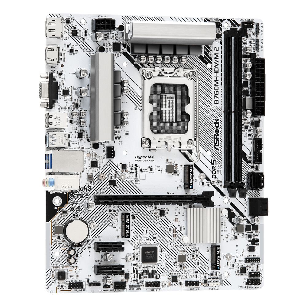 The ASRock B760M-HDV/M.2 offers excellent value for users building systems with Intel 12th, 13th, or 14th Gen processors who want DDR5 performance and solid connectivity in a micro ATX package. The 2.5Gb LAN, PCIe 4.0 M.2 support, and comprehensive I/O make it suitable for gaming, content creation, and everyday computing. Covered by the standard Manufacturer Warranty.