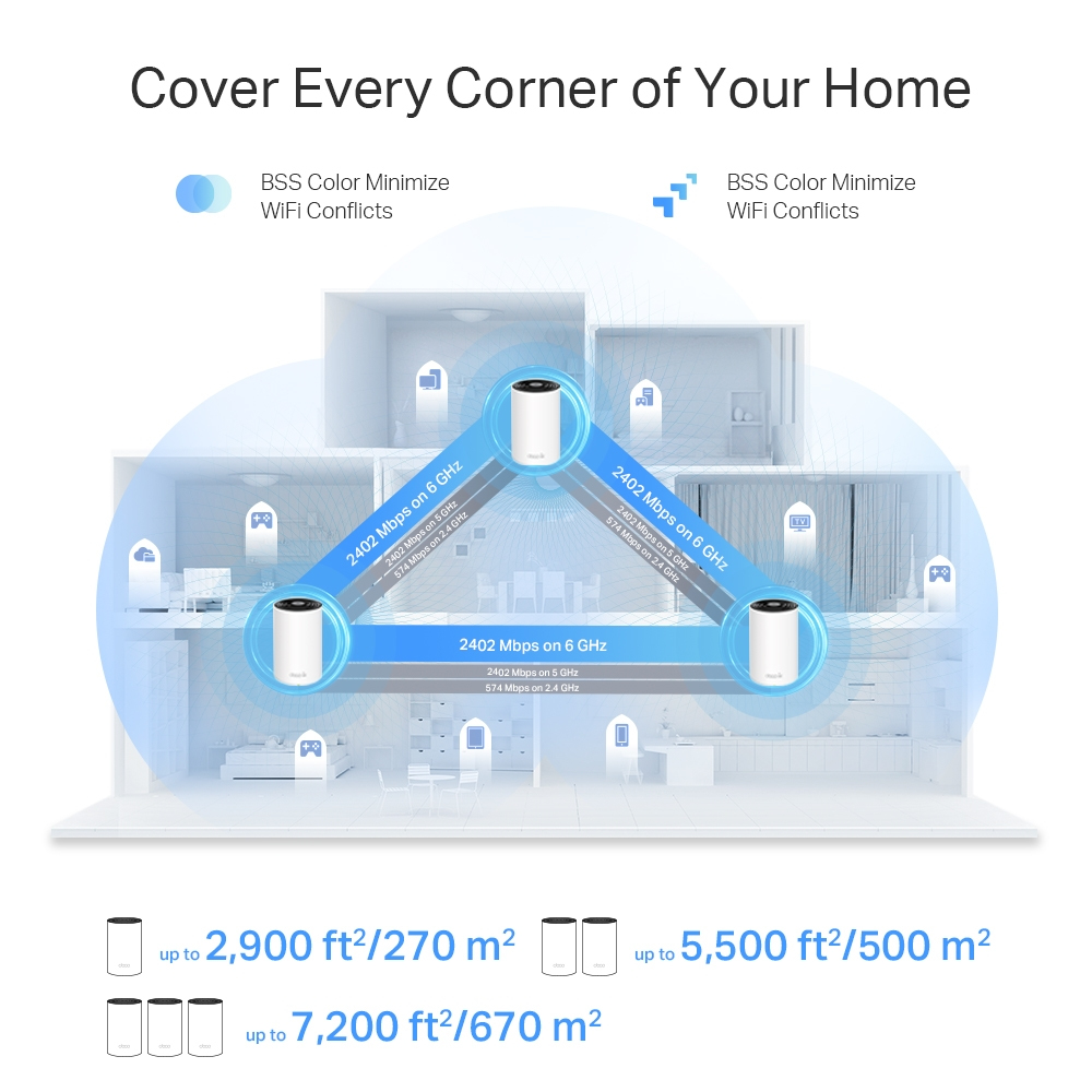 - Tri-band mesh WiFi 6E system with 670 m² coverage