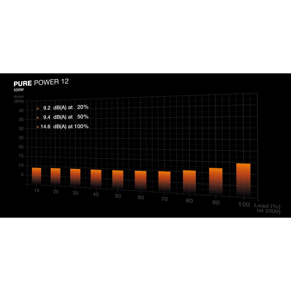 The PURE POWER 12 550W achieves an impressive 14.6 dB noise level thanks to its rifle-bearing 120mm fan and intelligent thermal management. This makes it ideal for home offices, content creation setups, and any environment where acoustic comfort matters. The fan only spins up when needed, ensuring virtually silent operation during light workloads.