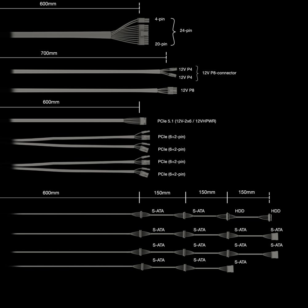 - Fully-modular cabling with 4 × 6+2-pin PCIe, 12-pin, and dual 4+4-pin EPS
