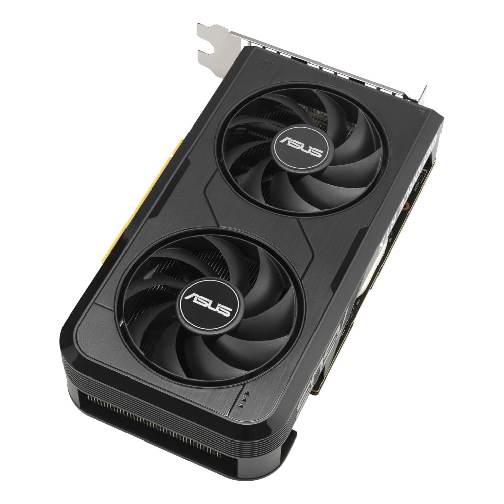 The ASUS Dual features two Axial-tech fans engineered specifically for its 2-slot form factor. These fans leverage chassis side-panel ventilation through a carefully designed shroud and heatsink layout, delivering thermal performance that exceeds expectations for its size. The smaller fan hubs allow for longer blades and a barrier ring that increases downward air pressure, while 0dB technology ensures silent operation during light workloads.