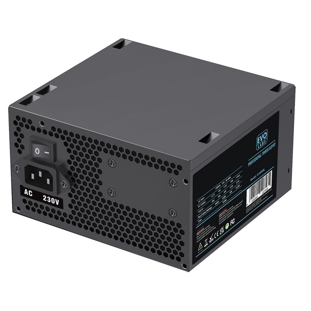 The EVO LABS BR600-12BL 600W PSU,120mm Black Silent Fan with Improved Ventilation, Non Modular, High-Efficiency, PFC Certified, CE Compliant, Retail Packaged delivers reliable power for desktop PCs. This non-modular ATX unit combines efficient performance with quiet operation, making it ideal for users who want stable computing without excess noise.