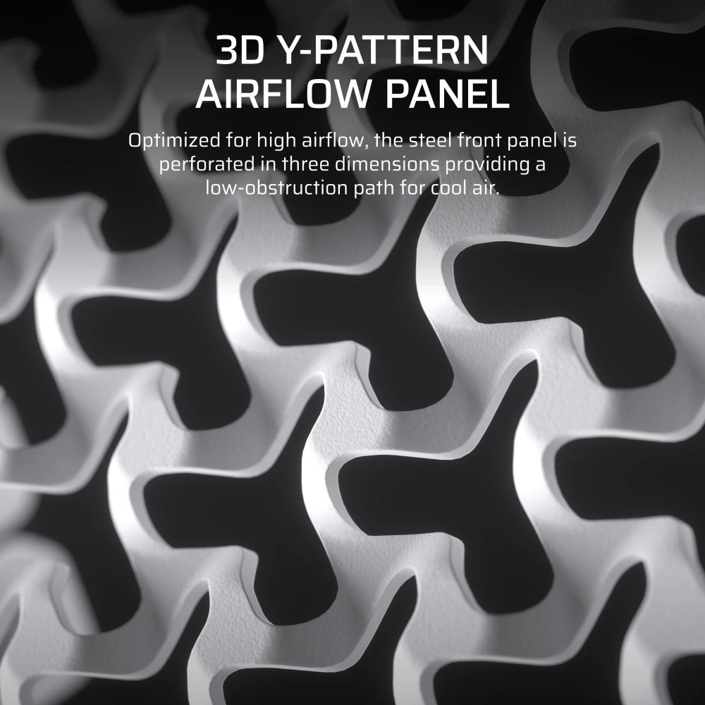 With the Infinirail fan mounting system, you can slide rails to position fans exactly where airflow is needed. The 3D Y-pattern steel front panel improves airflow by up to 12%, while support for up to 12x 120mm fans and three 360mm radiators (front, top, side) delivers exceptional thermal performance.
