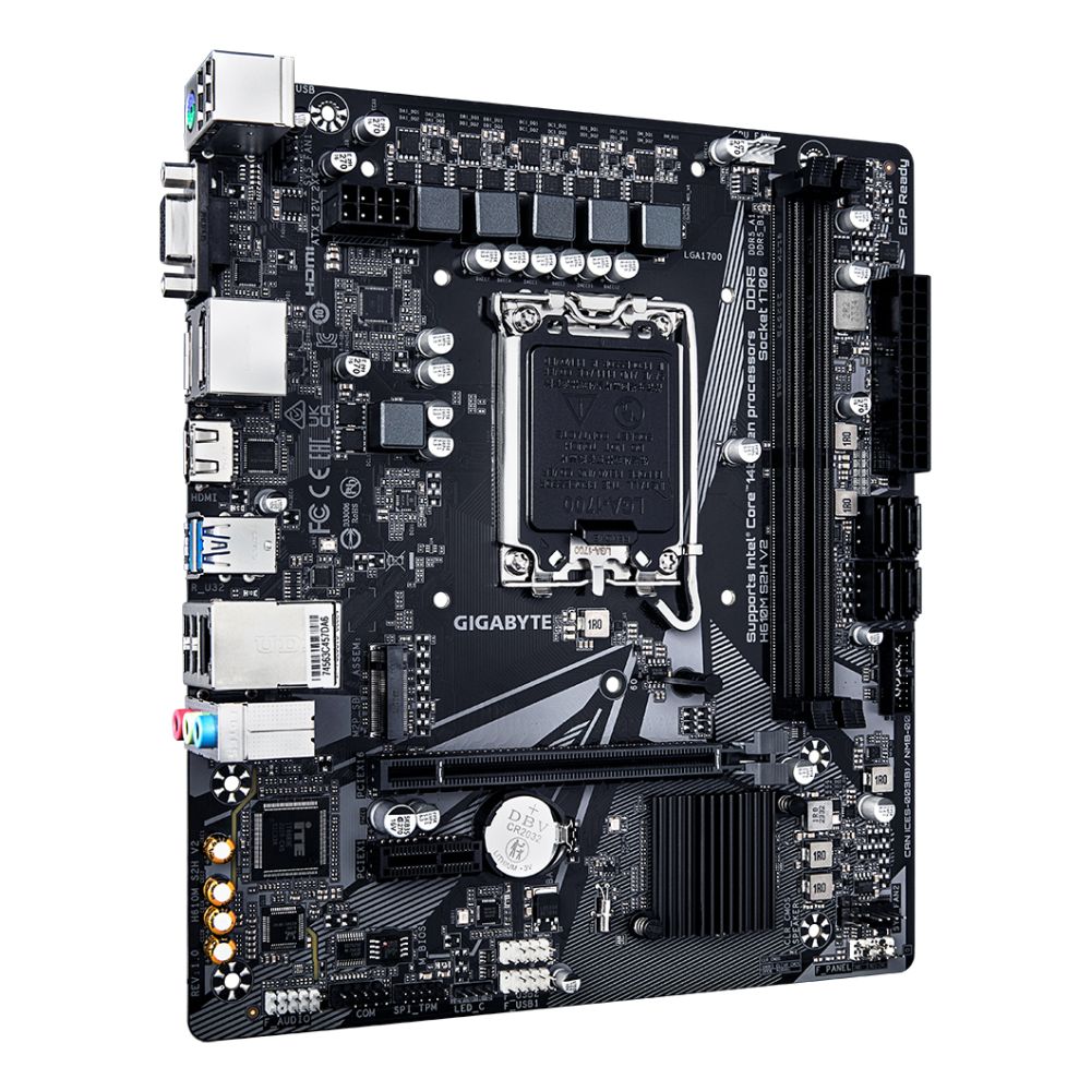 The GIGABYTE H610M S2H V2 Motherboard – Supports Intel Core 14th CPUs, 4+1+1 Hybrid Phases Digital VRM, up to 5600MHz DDR5, 1xPCIe 3.0 M.2, GbE LAN, USB 3.2 Gen 1 is engineered for compact builds requiring reliable Intel H610 performance. With support for 14th Gen Intel Core processors, DDR5 memory up to 5600MHz, and essential connectivity, it delivers stable everyday computing in a micro ATX form factor.