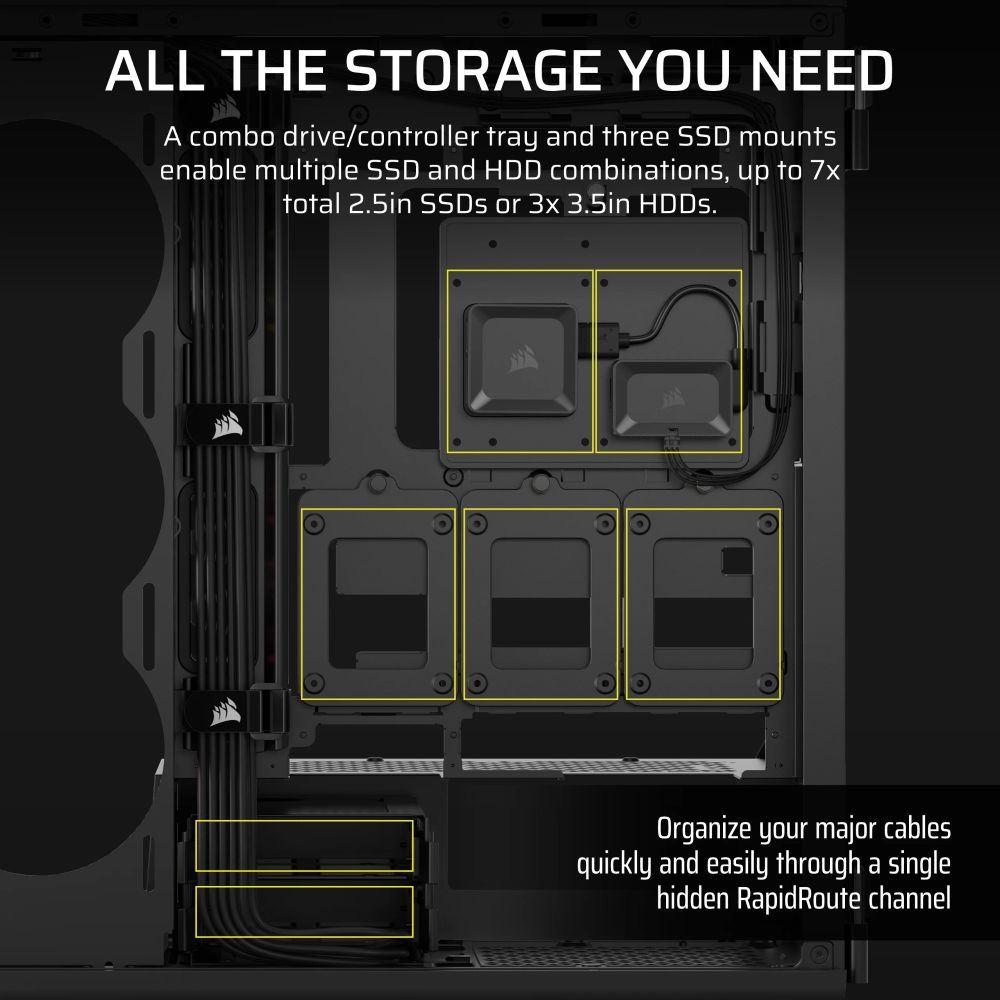 A: Yes, it features the CORSAIR RAPIDROUTE system with 46mm of space behind the motherboard and double-shot grommets.