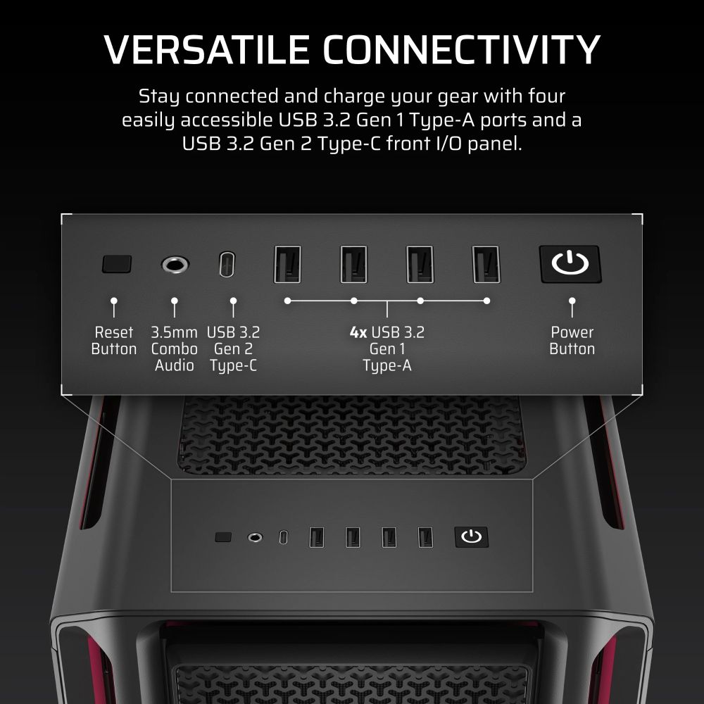 The front I/O panel puts all your connections within easy reach, including a USB 3.2 Gen 2 Type-C port for the latest high-speed devices, four USB 3.2 Gen 1 Type-A ports, and a combination audio/microphone jack. This comprehensive connectivity ensures you can easily connect peripherals, external drives, and other devices without reaching around to the back of your PC.