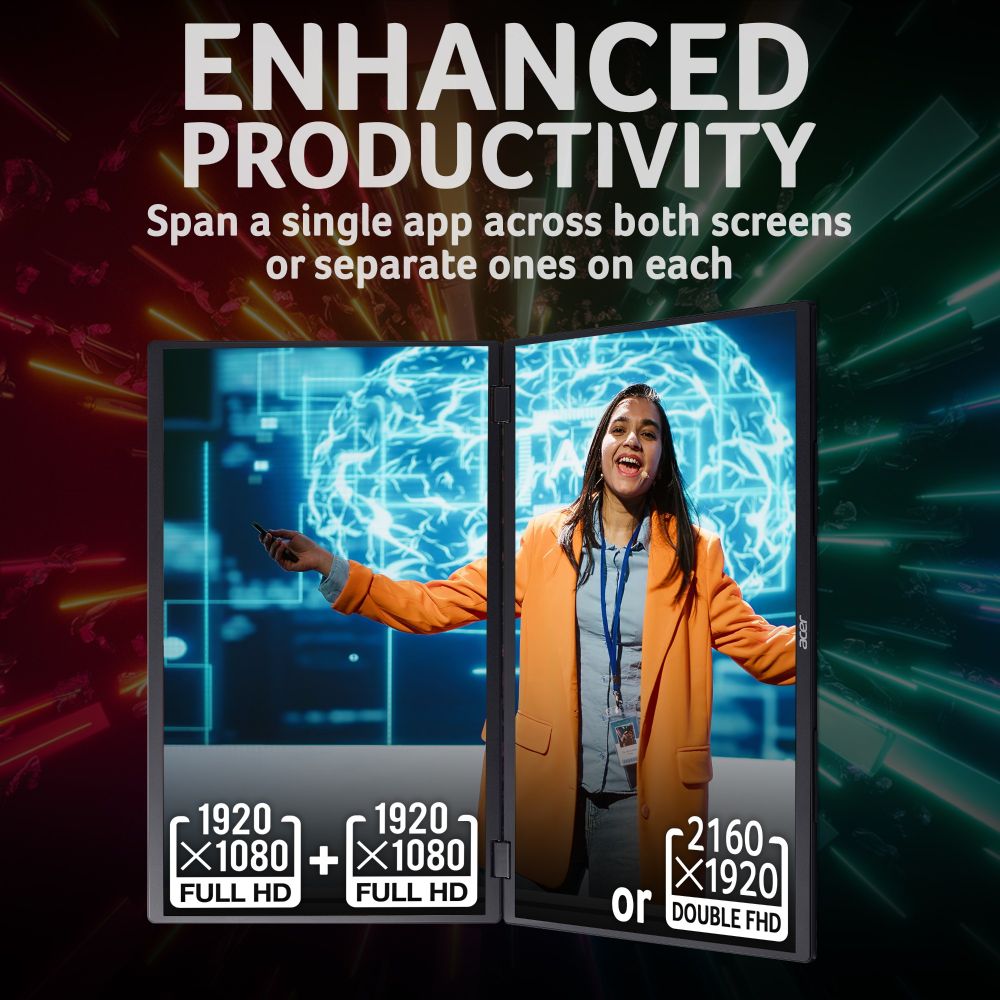 The Acer PD193QE foldable portable monitor is a dual-screen productivity powerhouse designed for professionals on the move. Featuring two 18.5″ Full HD IPS displays with a 100Hz refresh rate and 4ms response time, it delivers crisp visuals and smooth performance wherever you work. The integrated kickstand and foldable design make it easy to set up a dual-screen workspace in seconds, whether you’re at a coffee shop, client meeting, or traveling.