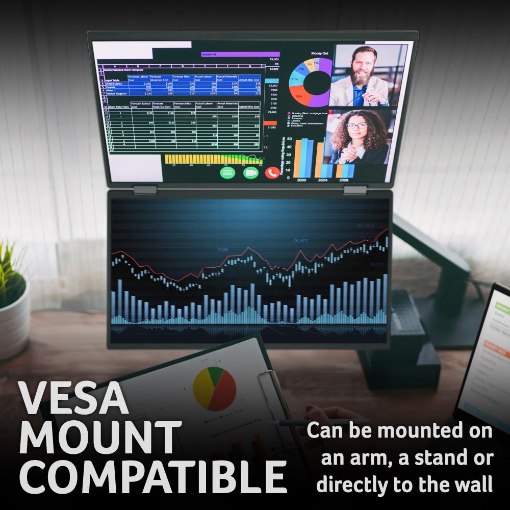 The IPS technology provides consistent colour accuracy and wide viewing angles across both screens. The 100Hz refresh rate ensures smooth scrolling and cursor movement, while the 4ms response time reduces motion blur during fast-paced work. Combined, the dual screens create an extended 2150 x 1080 resolution workspace that eliminates excessive scrolling and makes multitasking more efficient.