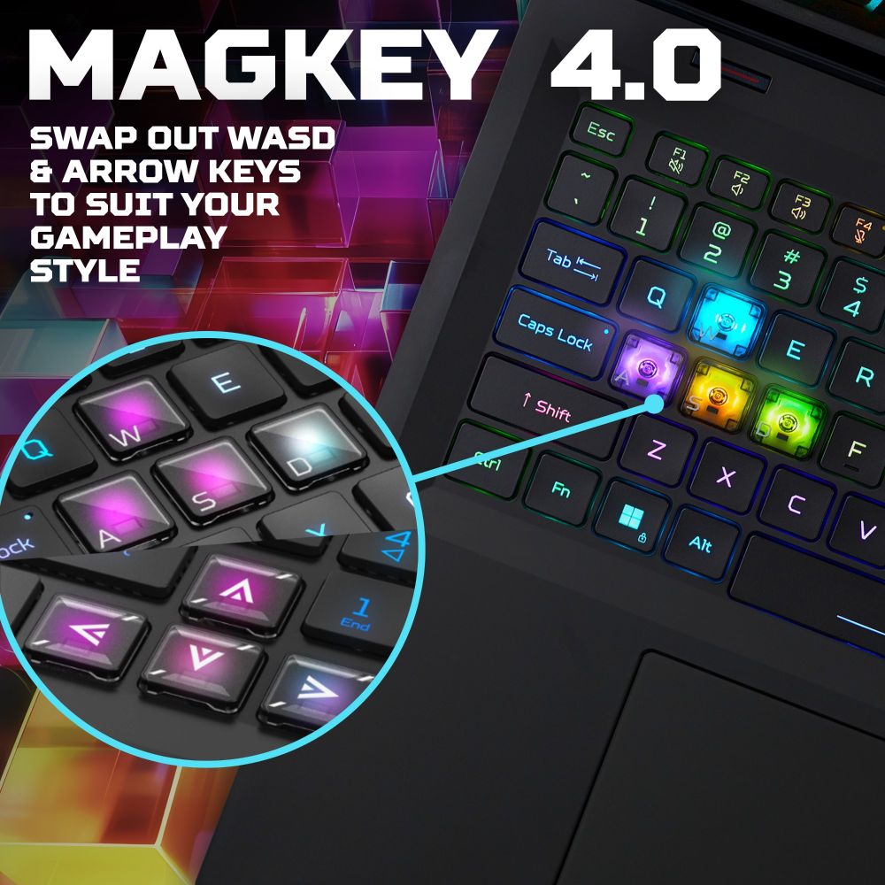 The per-key RGB keyboard uses MagKey 4.0 mechanical switches for precise actuation. It includes a numeric keypad and a dedicated Copilot key. Dynamic lighting extends to the palm rest and rear L-shape ring. This creates an immersive desktop atmosphere.