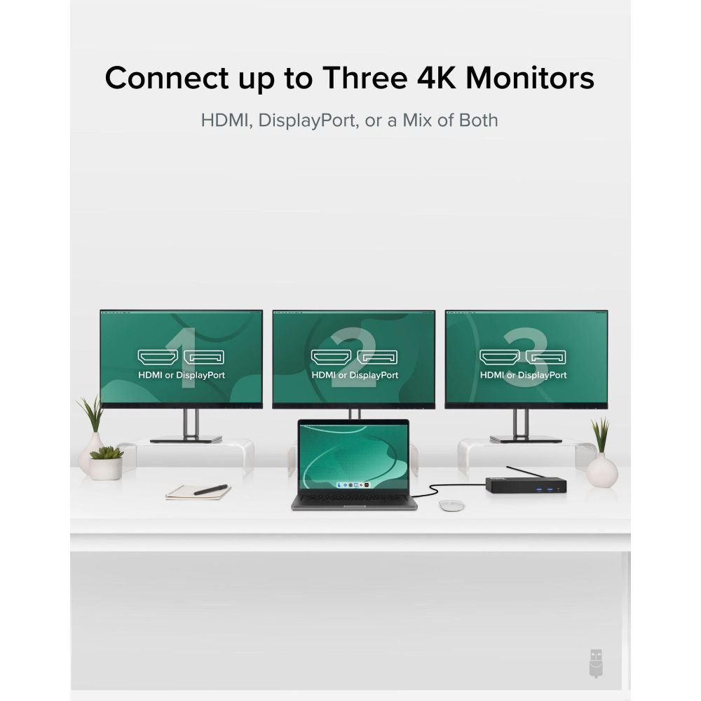 Connect up to three external displays simultaneously, each supporting 4K resolution at 60Hz. The dock provides three HDMI and three DisplayPort outputs, allowing flexible configuration without requiring adapters. This setup transforms any compatible laptop into a powerful multi-monitor workstation.