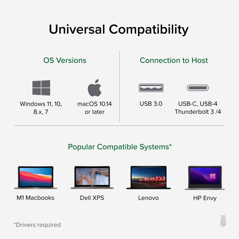 Works with Windows 10 (all editions), macOS 10.14 through 13.0 Ventura, and ChromeOS. The DisplayLink technology enables connection via either USB 3.0 or USB-C ports, providing flexibility across different laptop models. Note that this dock does not charge your laptop – you’ll need your existing charger.