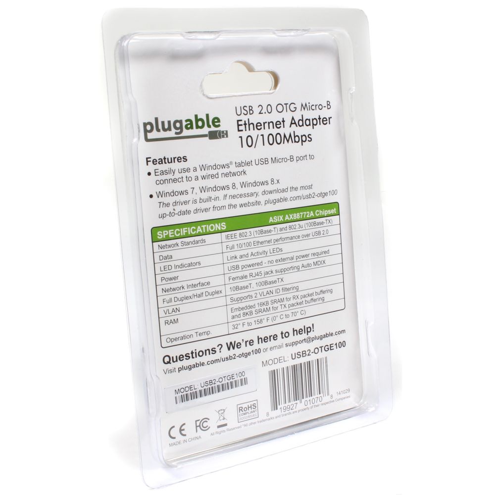 The Plugable USB2-OTGE100 is a smart choice for Windows tablet users and Raspberry Pi Zero hobbyists needing instant, reliable wired Ethernet. Its plug-and-play design and compact size make it especially convenient for travel or compact builds. Covered by the standard Manufacturer Warranty.