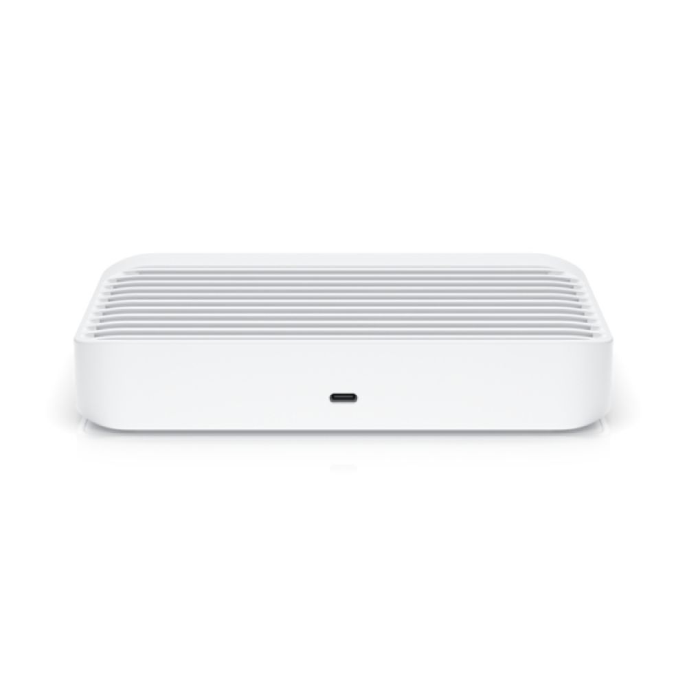 The USW Flex XG’s slim polycarbonate housing measures just 135mm wide and 32mm tall, allowing placement on desktops or in space-constrained installations. Despite its compact footprint, this switch delivers 82 Gbit/s switching capacity with 61. 012 Mpps forwarding rate, ensuring smooth traffic flow across all four 10GbE ports. The white finish and LED indicators provide clear status visibility while maintaining a professional appearance suitable for any office environment.