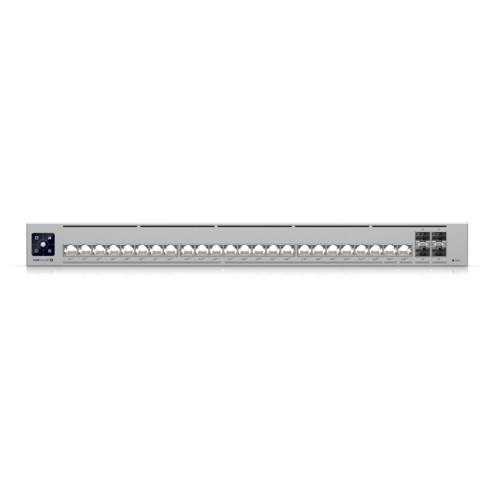The Ubiquiti UniFi Pro HD 24 PoE Managed L2/L3 2.5G Ethernet (100/1000/2500) Power over Ethernet (PoE) 1U Grey delivers enterprise-grade switching for high-density networks requiring 2.5 GbE and 10 GbE connectivity. With 24 PoE++ ports and 4 SFP+ uplinks, it supports demanding environments like VoIP, surveillance, and high-speed data applications.
