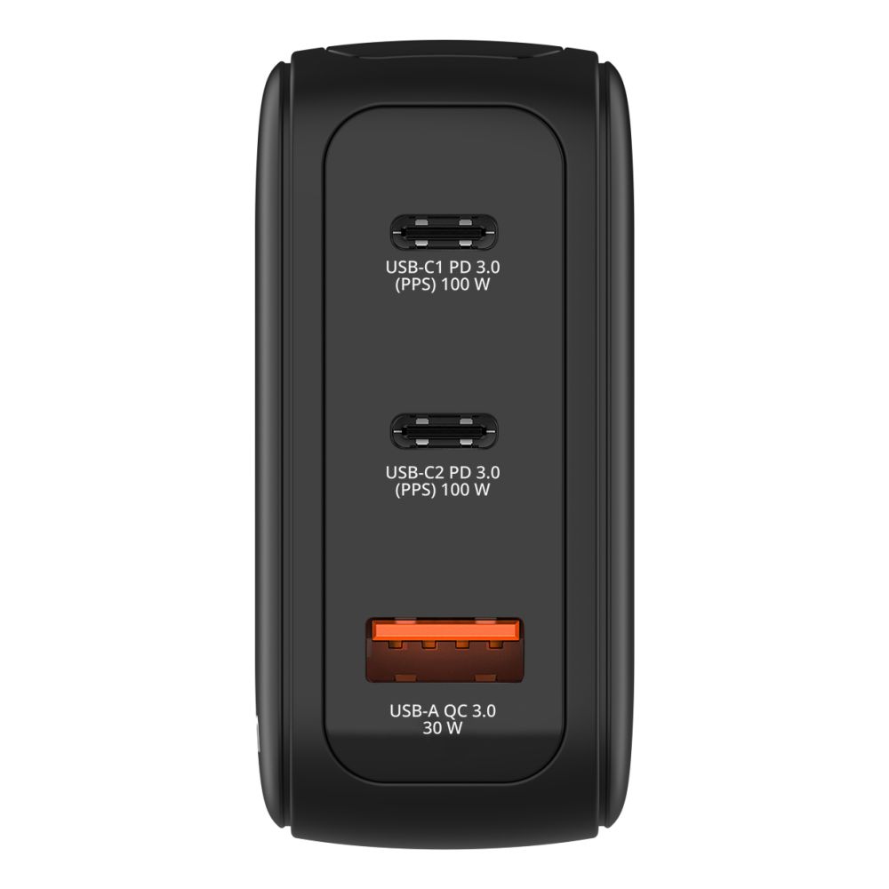 - Three ports: 2 × USB‑C (PD 3.0 up to 100 W) + 1 × USB‑A (30 W) for simultaneous device charging