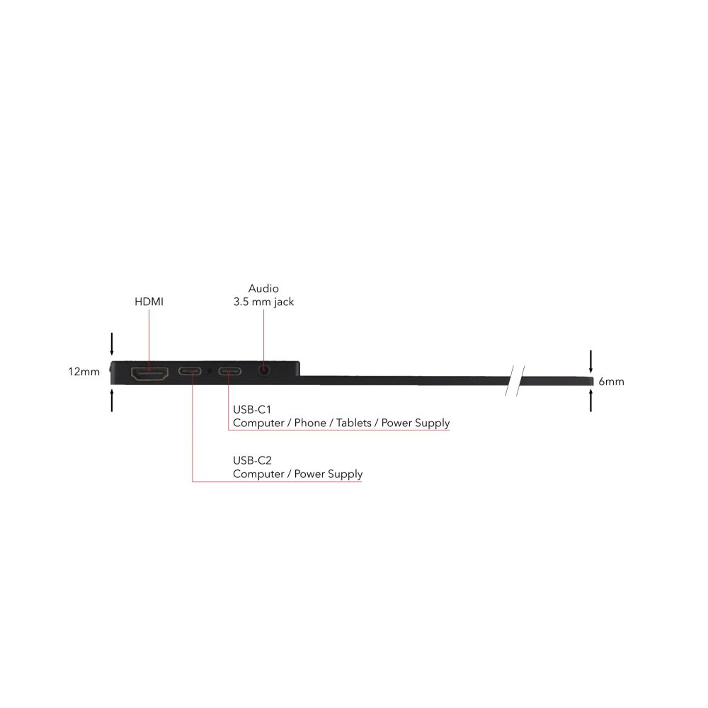 The monitor includes 1 x HDMI port (v1.4) and 2 x USB Type-C downstream ports. It supports USB Type-C DisplayPort Alternate Mode. For HDMI connection, a power supply is required; this is included in the box. For USB-C connection, power, data, and video transfer via a single cable. Note that an additional USB cable is required to support the touch function when using HDMI.