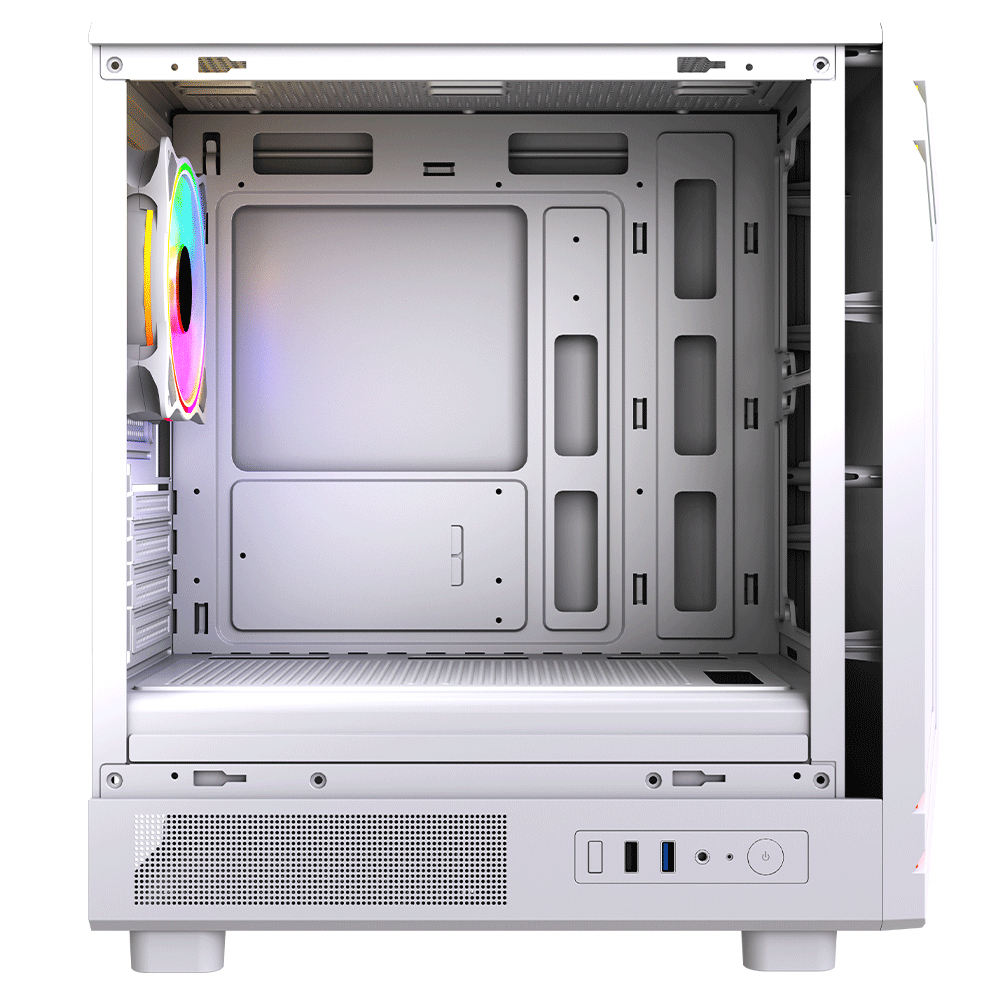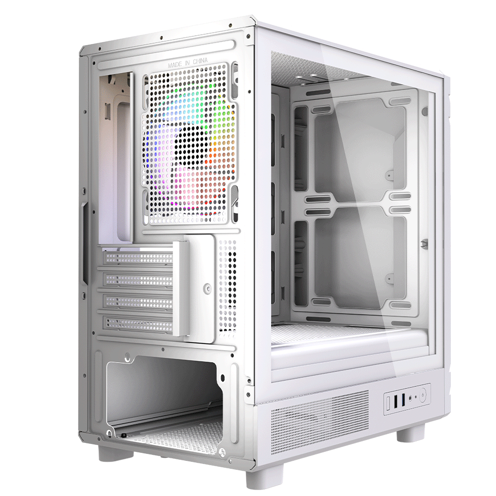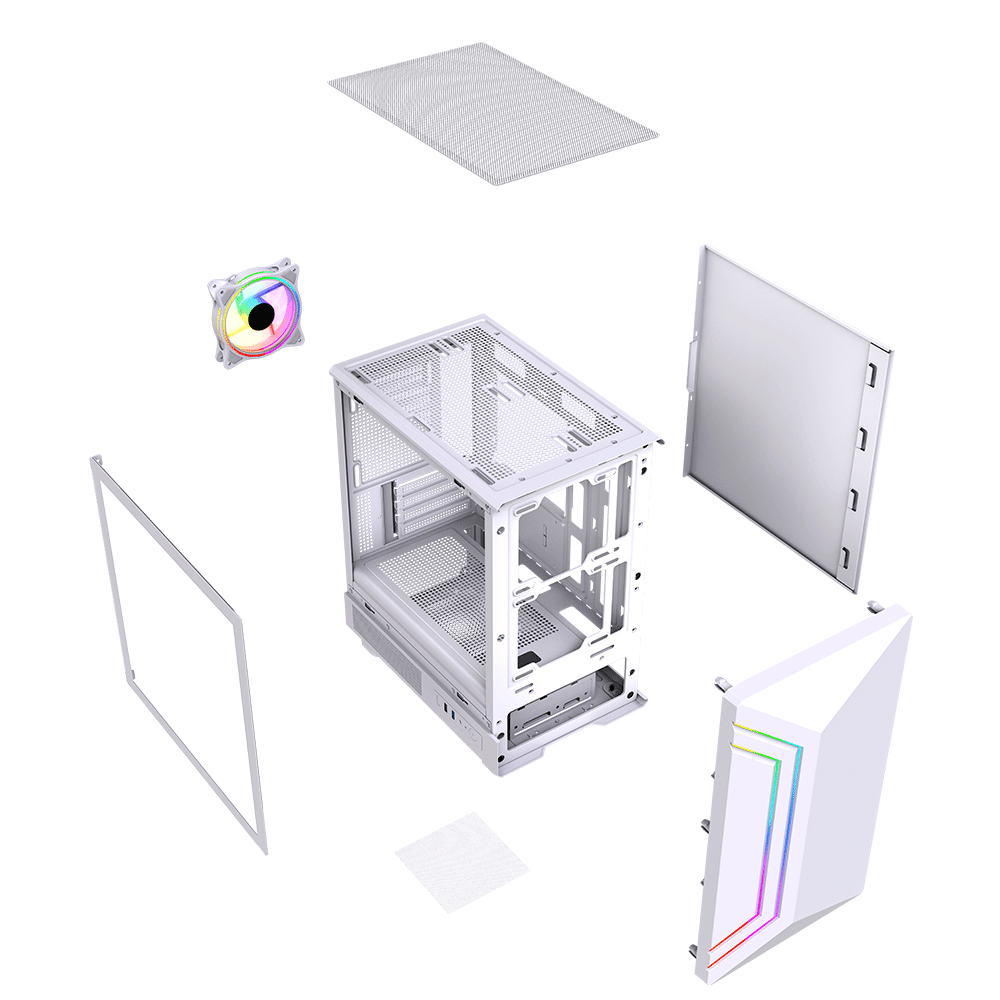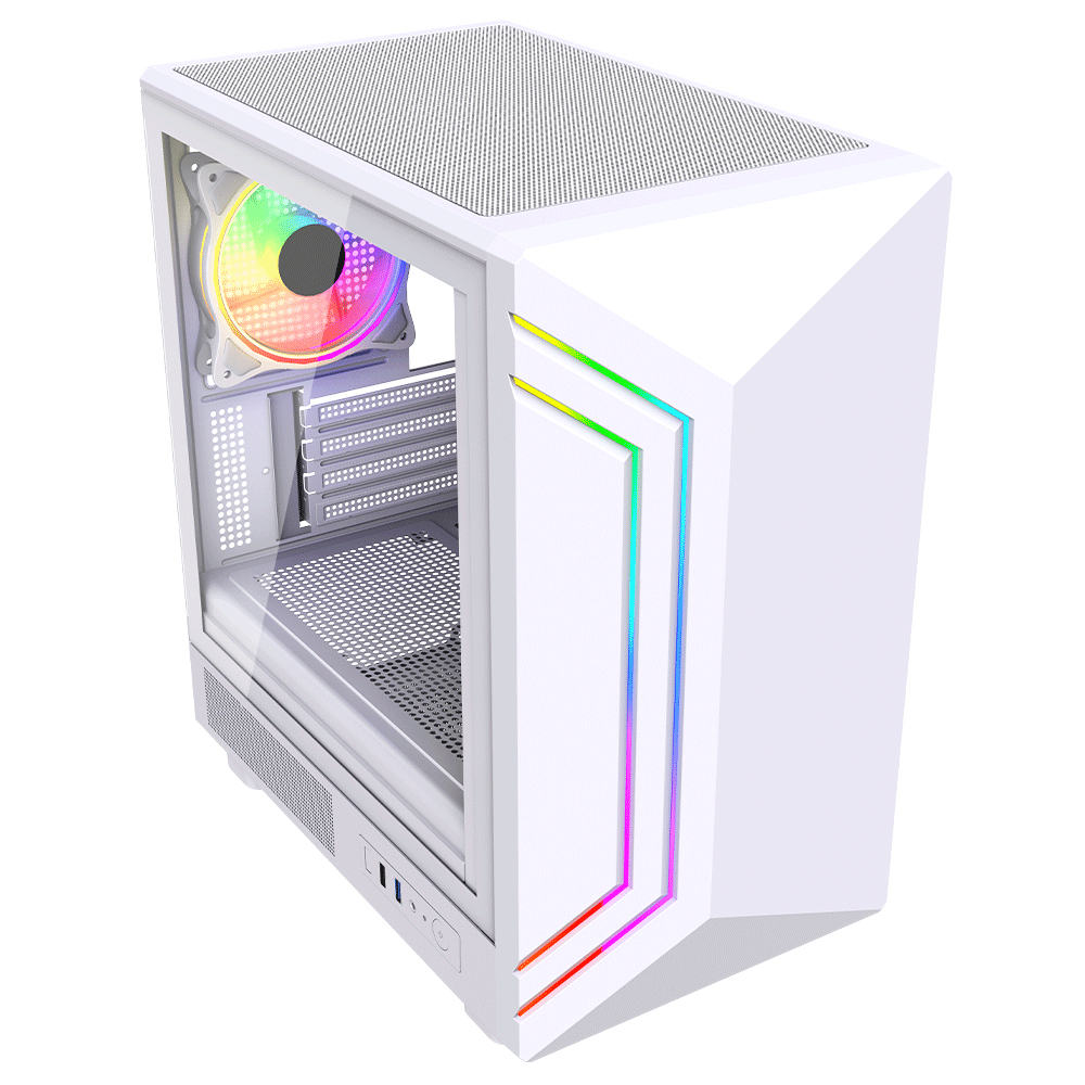 The VIDA Apollo M Tower White is a compact, stylish PC case designed for gamers and professionals who want a clean, illuminated build in a small footprint. With support for micro ATX and Mini-ITX motherboards, RGB fan lighting, and a tempered glass side panel, it delivers both aesthetics and expandability in a 360 x 218 x 380 mm frame.