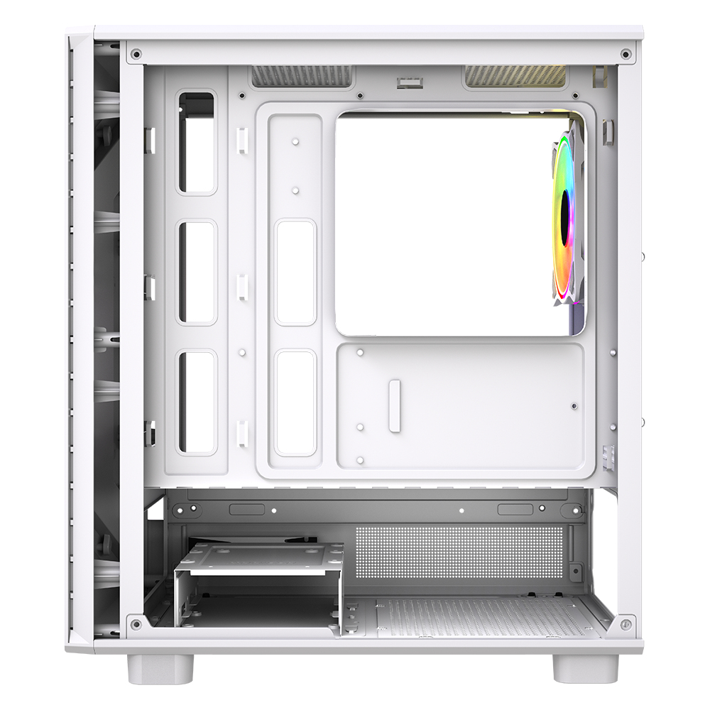 The VIDA Apollo M Tower White features RGB illumination located on the case fans, creating a vibrant multi-colour glow visible through the tempered glass side panel. This lighting setup enhances the visual appeal of your build without requiring additional LED strips or controllers. The white finish complements the lighting effect, making it ideal for users who want their hardware to stand out.