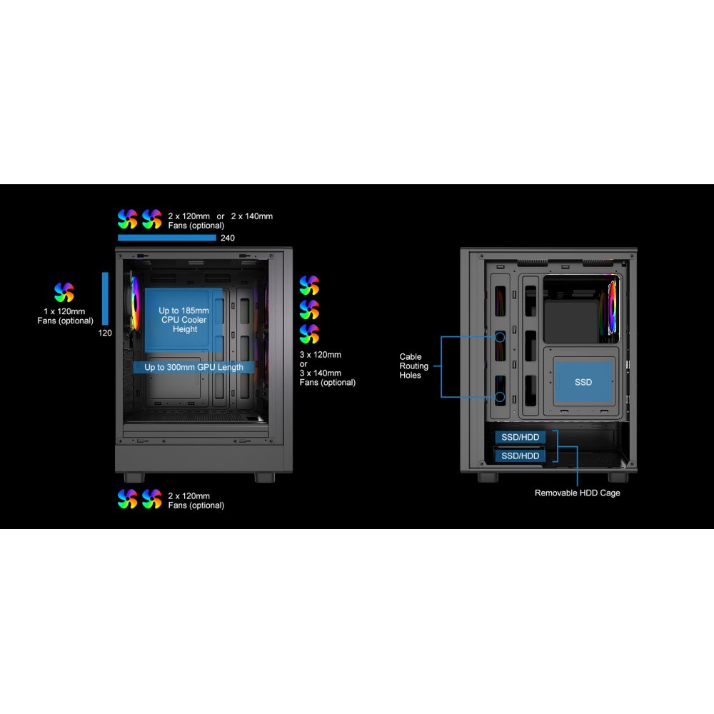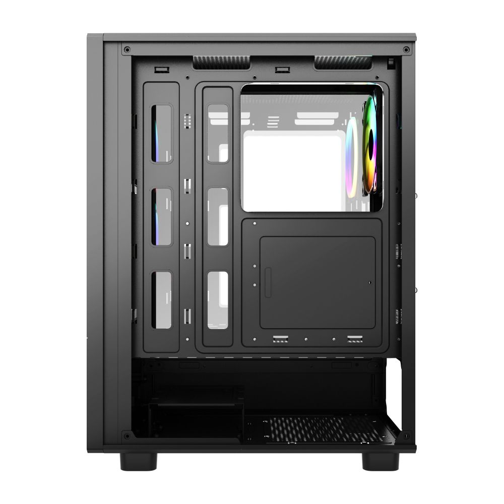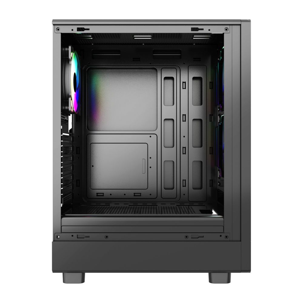 A full tempered glass side panel showcases your internal hardware and RGB lighting, adding a premium look to your setup. The case also features a reset button, on/off button, and cable management support, making assembly and upgrades straightforward.