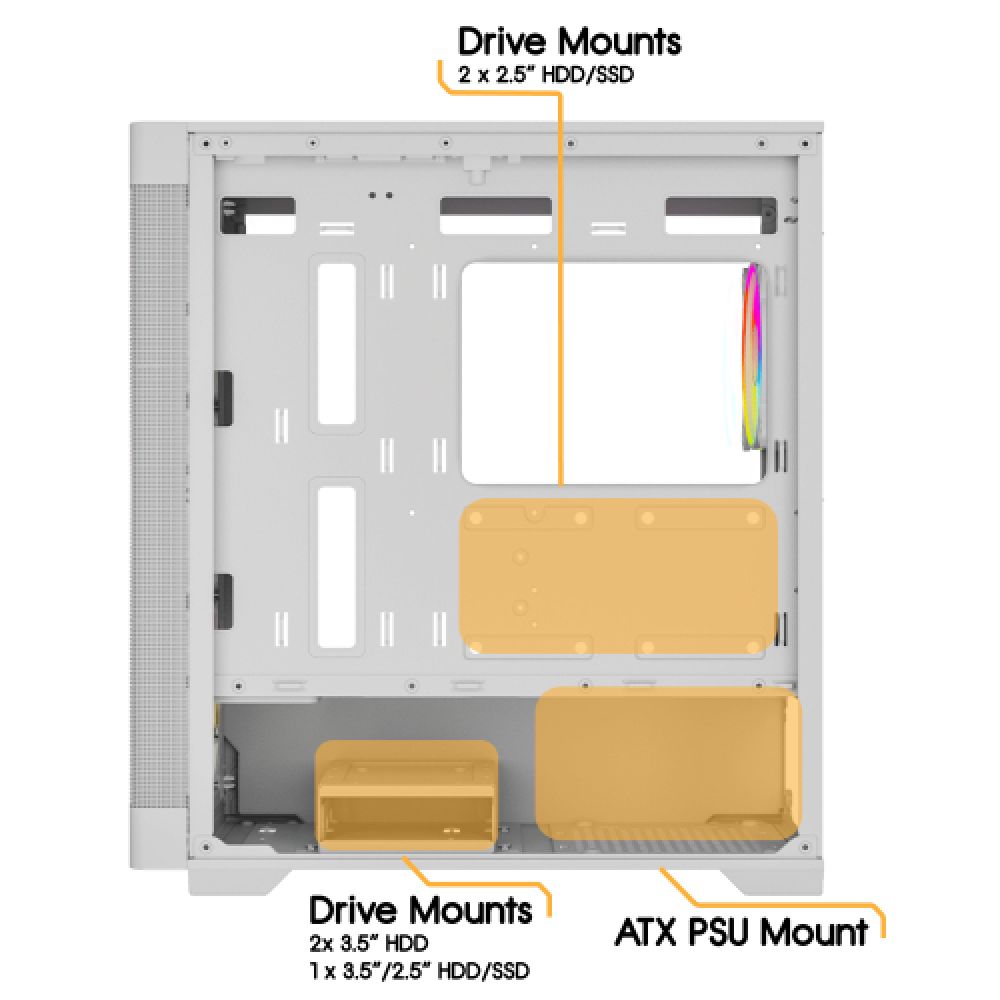 The Zephyr V2 combines a robust metal frame with tempered glass panels for a premium feel. Its front mesh bezel promotes optimal airflow, while the white finish offers a clean, modern look that complements any gaming or office setup.