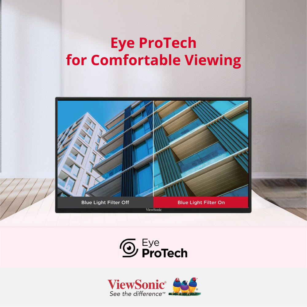 ViewSonic’s Eye ProTech technology protects your vision during extended use. The Flicker-Free technology eliminates screen flickering that can cause eye strain, while the Blue Light Filter reduces harmful blue light emissions. These features work together to maintain comfortable viewing during long work sessions, making the VA1650 suitable for professionals who spend hours in front of screens.