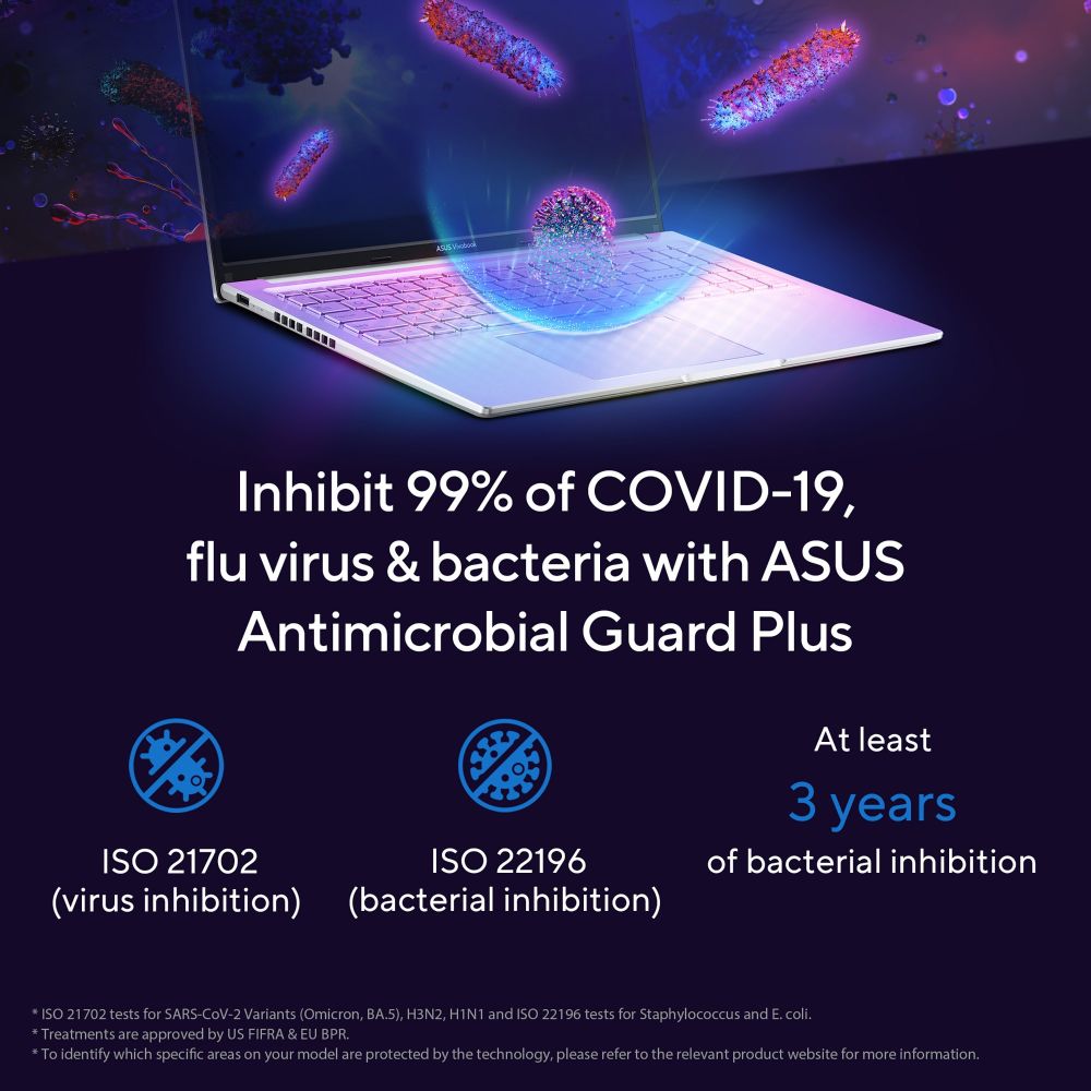 Your privacy is protected with a physical webcam shutter and dedicated function keys to control microphone and camera access. The ASUS Antimicrobial Guard Plus coating protects frequently-touched surfaces, while the Trusted Platform Module (TPM) provides hardware-based security for your data. The 180° lay-flat hinge allows flexible positioning while maintaining stability.